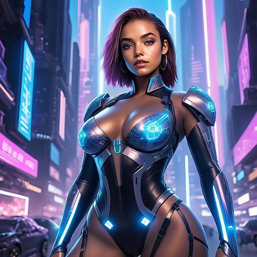 Confident Woman in Futuristic Armor in Neon Cyberpunk City
