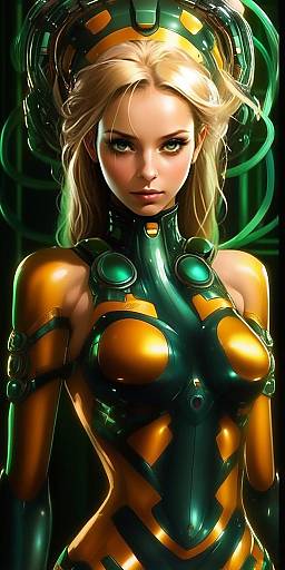 Futuristic Woman in Neon Cyberpunk Armor with Glowing Green Lights