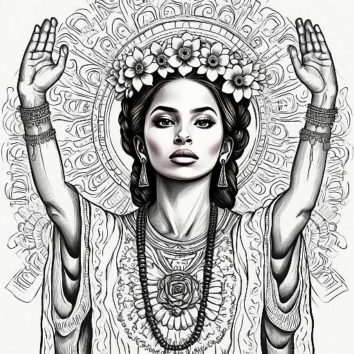 Monochromatic portrait of a woman in floral crown and traditional attire