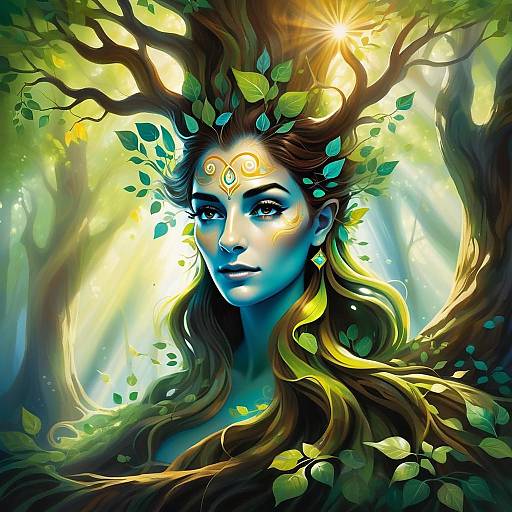 Enchanting Woman with Blue Skin in a Mystical Forest
