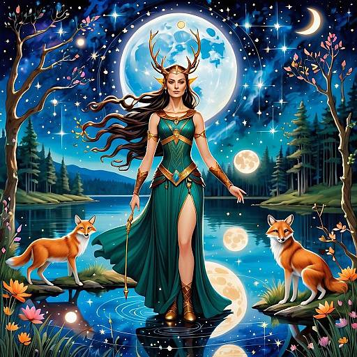 Mystical Forest with Woman in Green Outfit and Antler Headdress