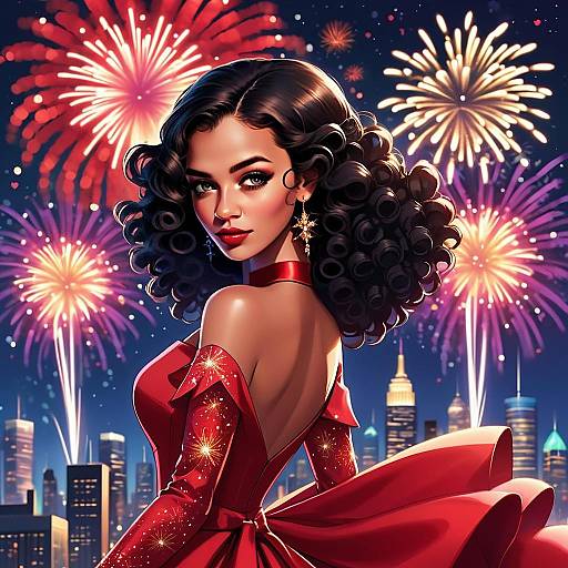 Glamorous Woman in Red Dress with Fireworks