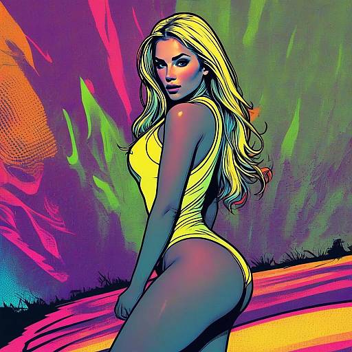 Pop Art Blonde Woman with Floral Tattoos Sitting on Surfboard at Beach