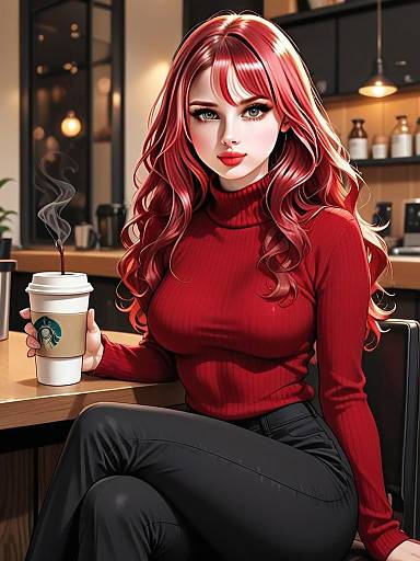 Woman with Curly Red Hair in Stylish Green Turtleneck at Desk