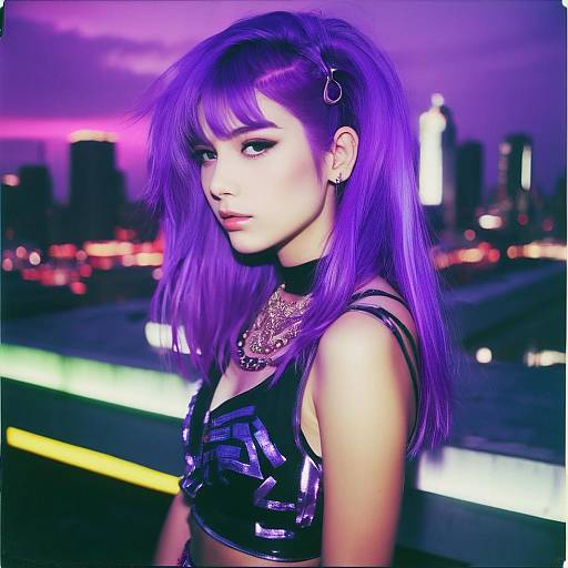 Cyberpunk Woman with Neon Hair and Leather Jacket on Rooftop at Night