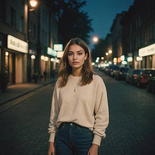 Elegant young woman in urban street at dusk with Kodacolor film aesthetic