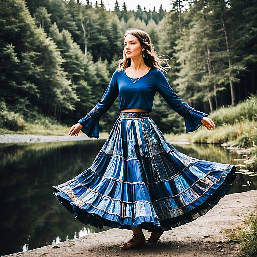 Woman Twirling by Serene River in Blue Skirt