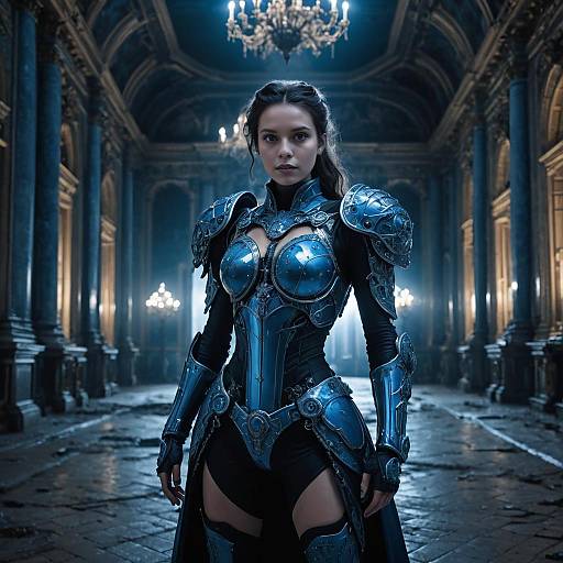 Warrior Woman in Golden Armor Against Mountain Sunset
