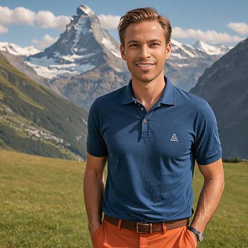 Man in Vibrant Outdoor Gear Against Mountainous Backdrop