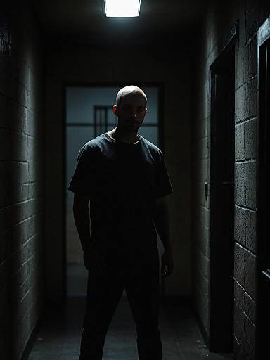 Solemn Man in Prisoner Clothes in Noir Jail Hallway