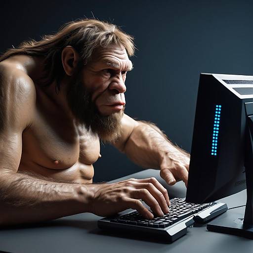 Neanderthal Man Working on a PC - Artistic Interpretation