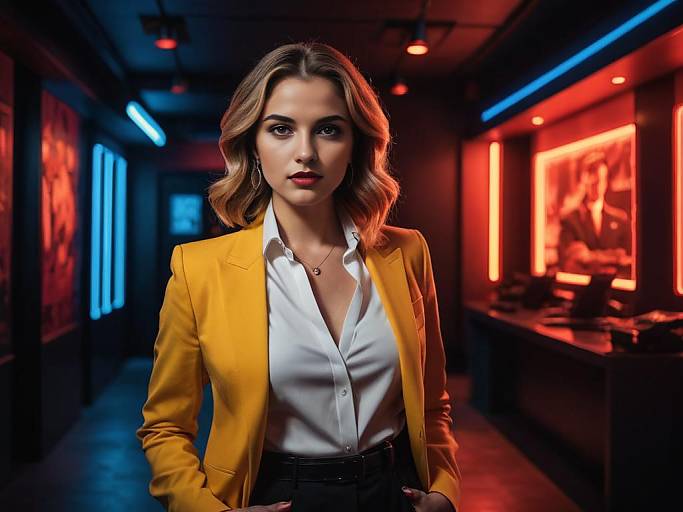 Confident Woman in Purple Blazer Amidst Vibrant Lights