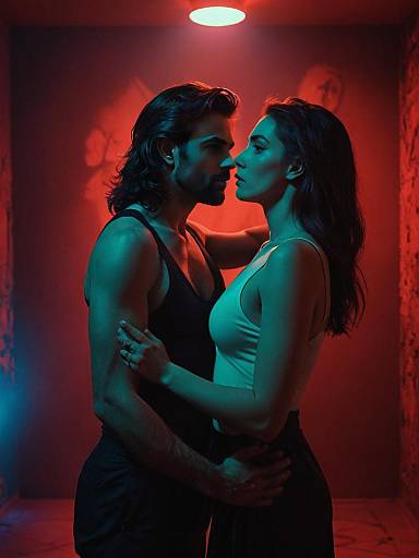 Romantic embrace of a shirtless man and woman in a glittery dress