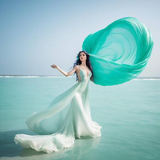 Elegant Woman in Mint-Green Gown in Ethereal Landscape