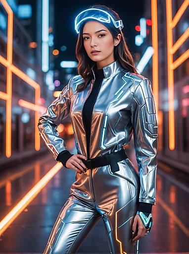 Futuristic Woman in Silver Bodysuit with Neon Cyberpunk Lights