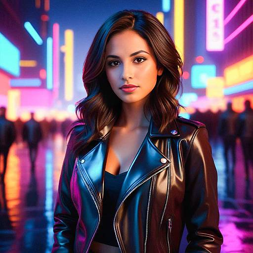 Confident Woman in Leather Jacket with Neon Lights