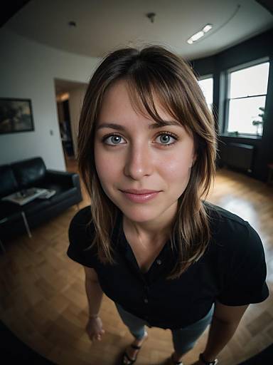 Woman with Short Brown Hair and Green Eyes in Indoor Setting