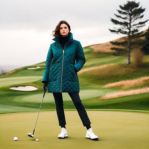 Chic Woman in Green Puffer Jacket in Urban Winter Setting