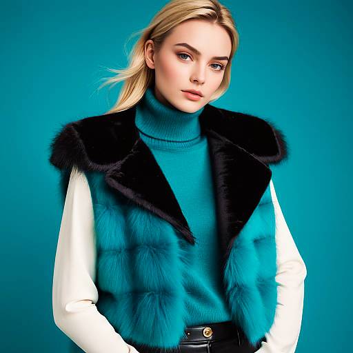 Woman Wearing Chic White Bell Sleeve Blouse with High Neckline and Faux Fur Vest