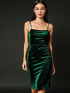 Elegant Woman in Dark Green Velvet Dress with Spaghetti Straps
