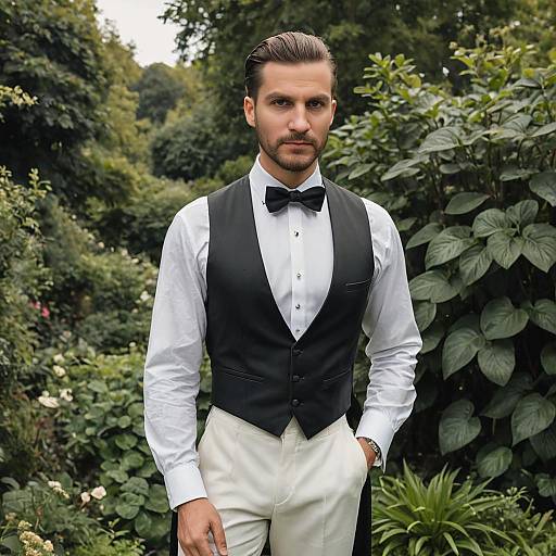 Stylish Man in Black Waistcoat and Bow Tie in Garden
