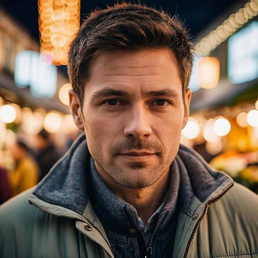Muscular Man in Stylish Tank Top at Vibrant Market