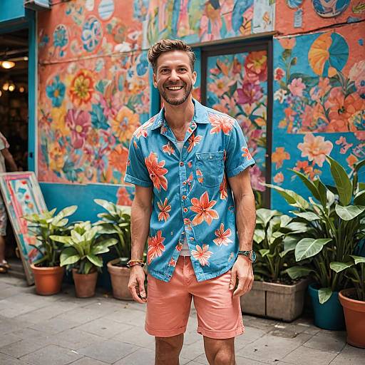 Smiling Man in Colorful Shirt Against Vibrant Mural