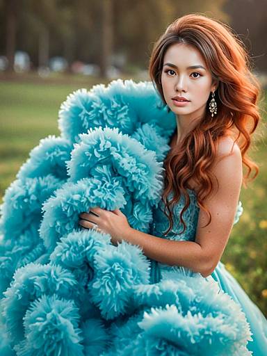 Elegant Woman in Ruffled Dress Resembling Book Pages