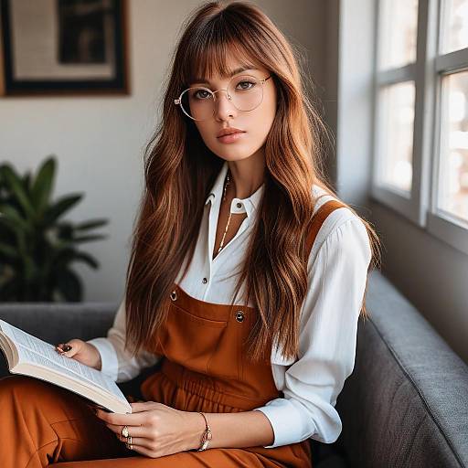 Young Woman in Gray Plaid Two-Piece Outfit with Bow Tie and Glasses