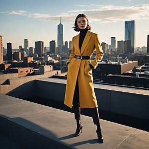 Confident Woman in High Fashion Against Urban Skyline at Night