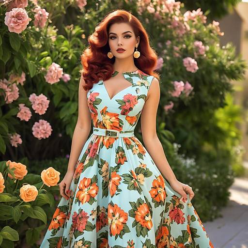 Young Woman With Curly Hair in Floral Dress Posing in Garden