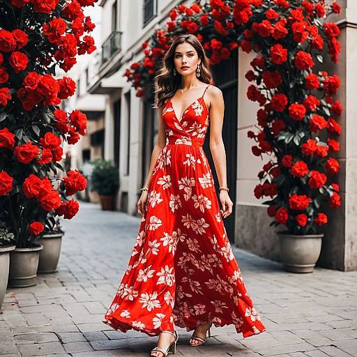 Woman in Red Lace Top and Floral Skirt on Cobblestone Street