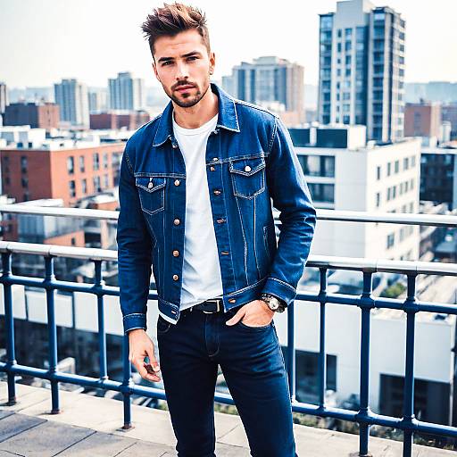 Stylish Young Man in Denim Jacket Against Blue Wall