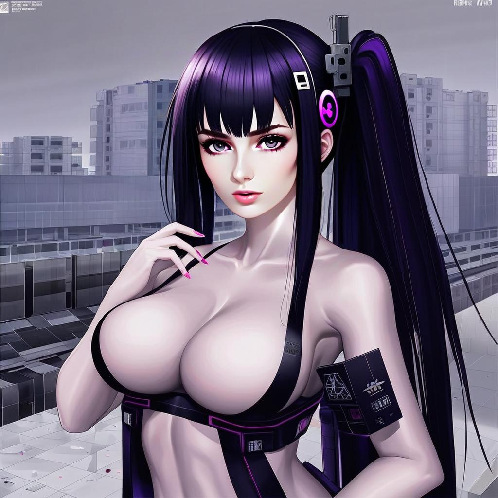 This digital anime-style illustration features a confident woman with long, dark purple hair tied in a high ponytail, set against a modern urban backdrop with industrial buildings. The character is portrayed with detailed shading and highlights, wearing a revealing black and purple outfit that blends futuristic and tactical elements, embodying a cyberpunk aesthetic.