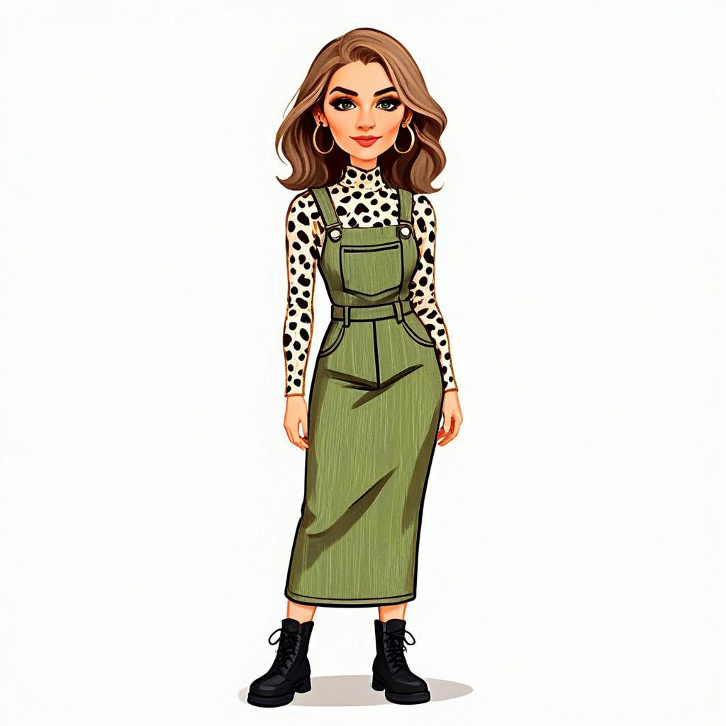 This digital illustration features a stylish woman with a pretty face and voluminous hair, dressed in an urban chic outfit. She wears a leopard print long-sleeve top paired with an olive green pinafore dress and black combat boots, exuding a modern and trendy vibe.