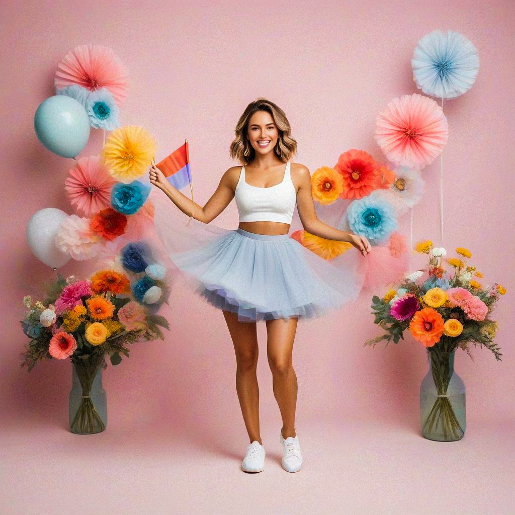 A cheerful woman poses in a vibrant, pastel-themed setting, showcasing a playful outfit complemented by an eye-catching tulle skirt. The backdrop features an array of colorful flowers and decorative balloons, creating a festive and joyful atmosphere.