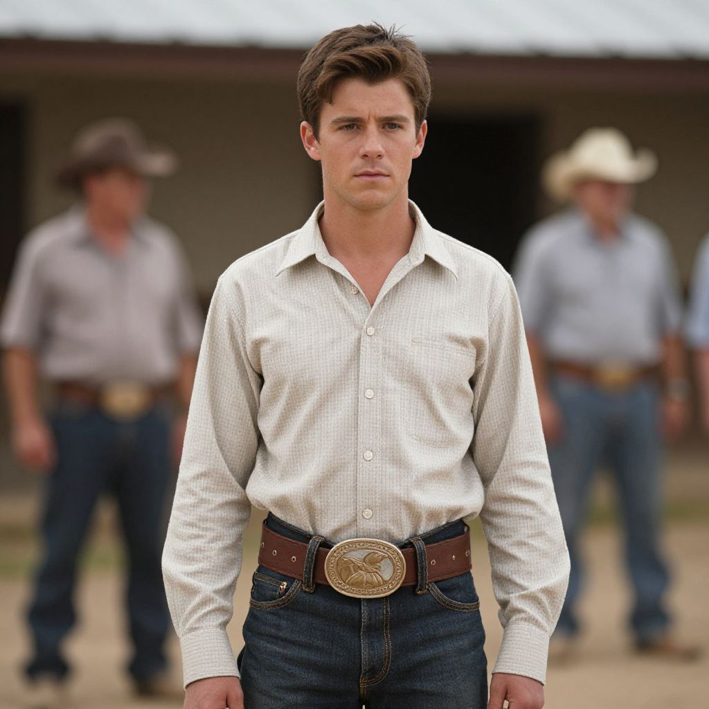 A young man dressed in classic western attire stands confidently in the foreground with a serious expression, wearing a light-colored button-up shirt and dark jeans accented by a large decorative belt buckle. Behind him are three men blurred out, also dressed in cowboy style clothing, suggesting a rural or rodeo setting. The image captures a moment of focus and determination, typical of modern western portrait photography.