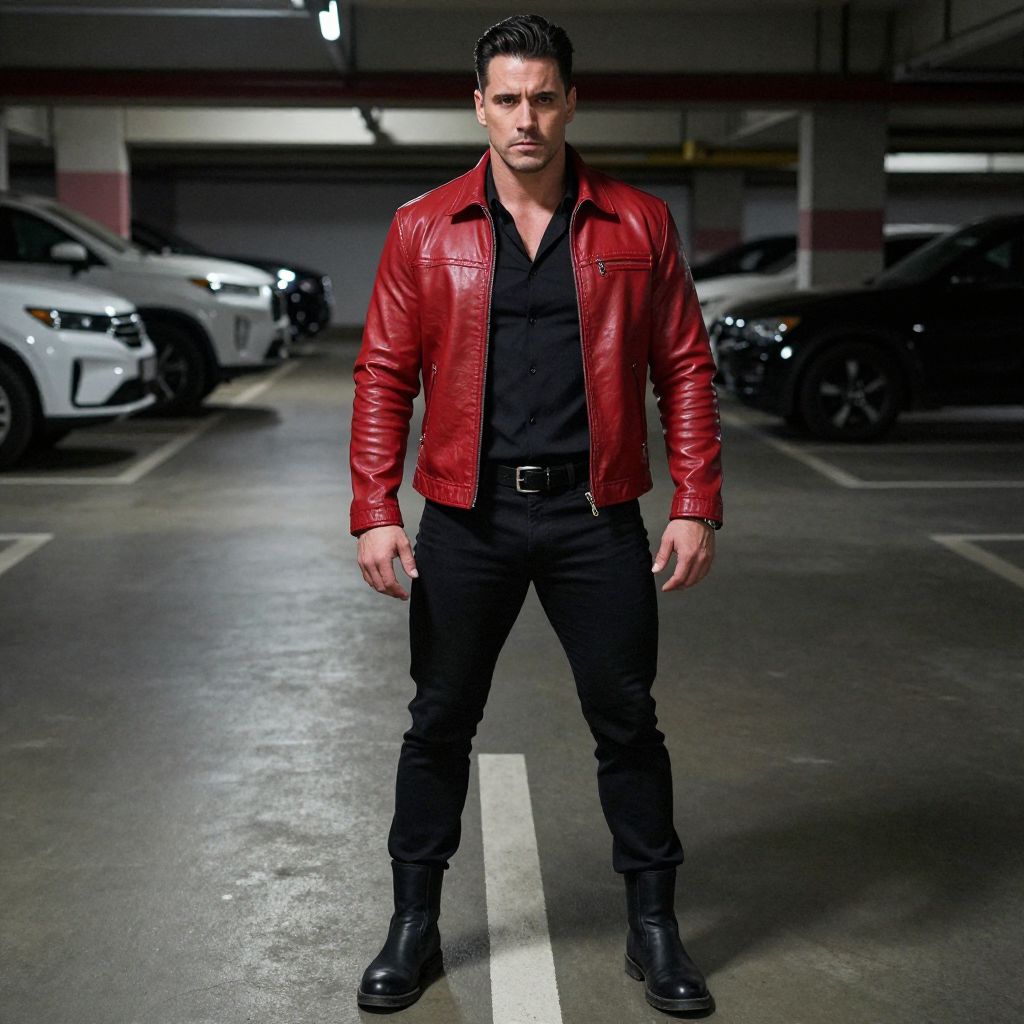 A confident man stands in an underground parking garage wearing a striking red leather jacket over a black shirt and pants, complemented by black boots. The image features a modern, urban style with dramatic lighting that highlights his strong and assertive pose.