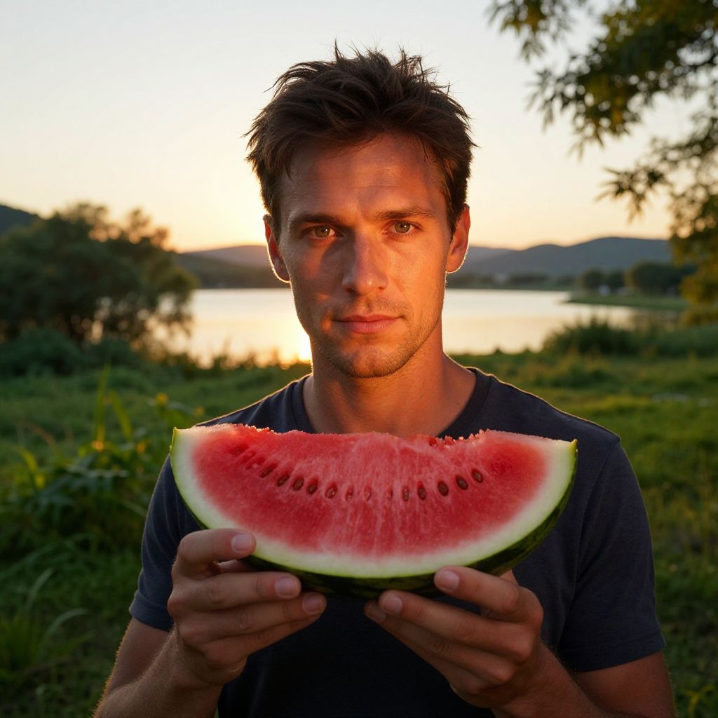 A young man holds a large slice of fresh watermelon outdoors during sunset, with a natural landscape of trees and a lake in the background. The warm golden light enhances the vibrant red of the fruit and the subject's contemplative expression.