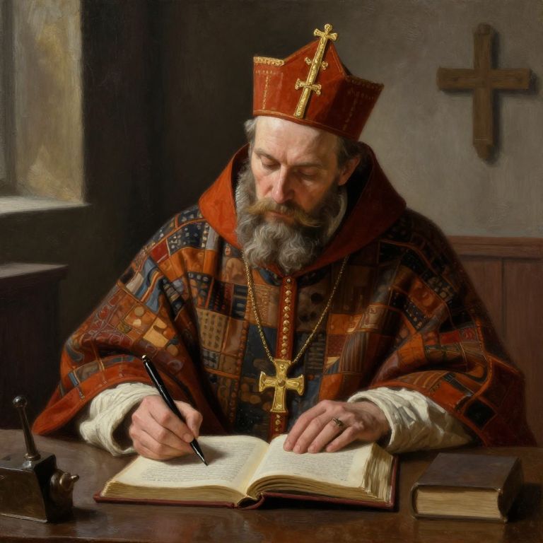 A bearded man dressed as a bishop, wearing richly patterned ecclesiastical robes and a red mitre with a gold cross, is seated at a wooden table writing diligently in a large open book. The scene is illuminated by natural light coming through a nearby window, with a wooden cross hanging on the wall behind him, creating a solemn and contemplative atmosphere reminiscent of classical religious portraiture.
