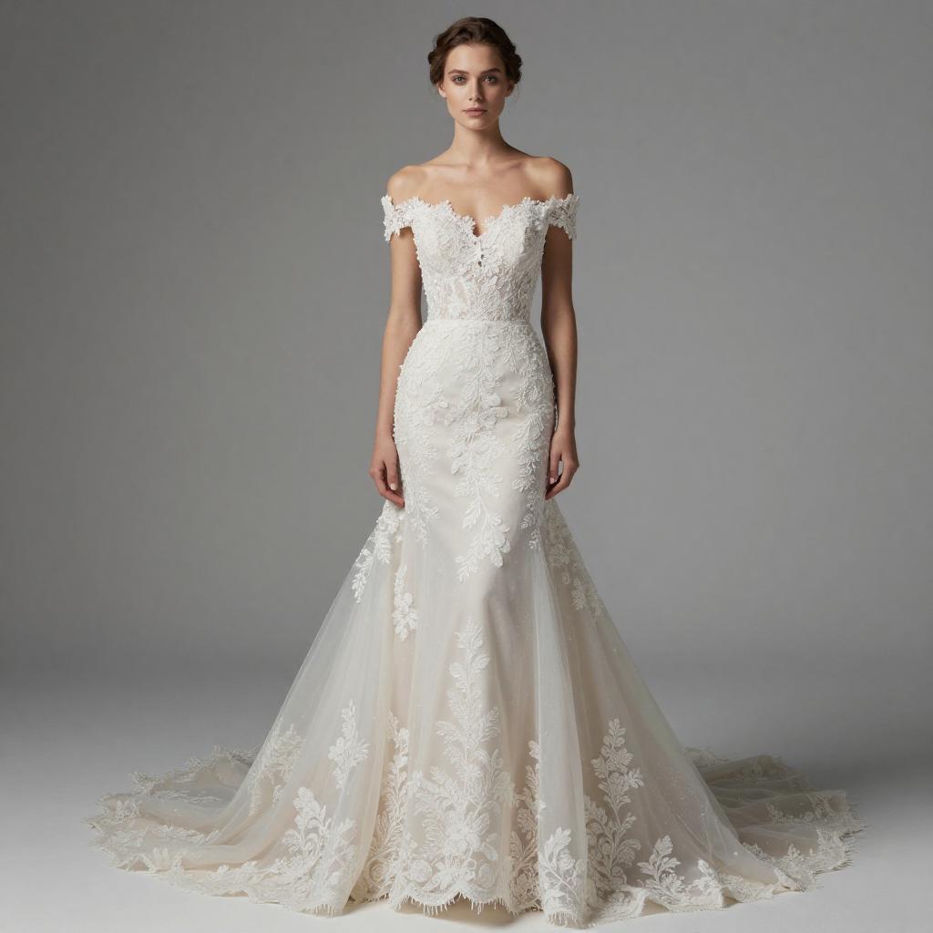A woman models a stunning off-the-shoulder wedding gown featuring intricate lace detailing and a flattering mermaid silhouette. The dress elegantly flows into a delicate, embroidered train, combining classic romantic style with modern sophistication.