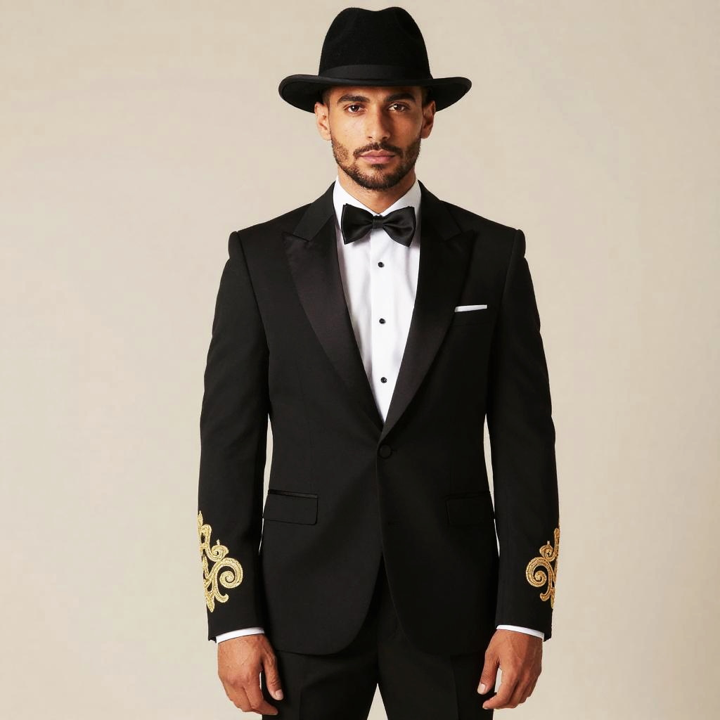 Elegant Black Suit with Gold Embroidery and Black Hat Menswear