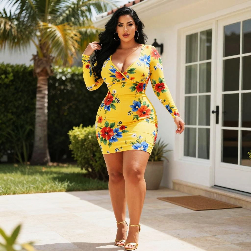 A confident woman stands outdoors wearing a vibrant yellow bodycon dress adorned with red, blue, and orange floral patterns. The dress, featuring long sleeves and a deep V-neckline, accentuates her curves, complemented by gold high-heeled sandals in a sunny garden setting.