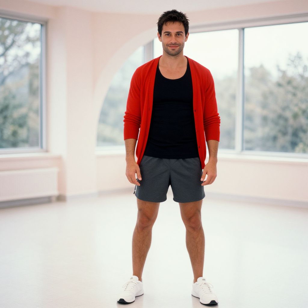A confident young man stands in a bright, spacious room with large windows and a soft, neutral background. He is dressed casually in a black tank top, red cardigan, gray shorts, and white sneakers, presenting a relaxed and approachable style.