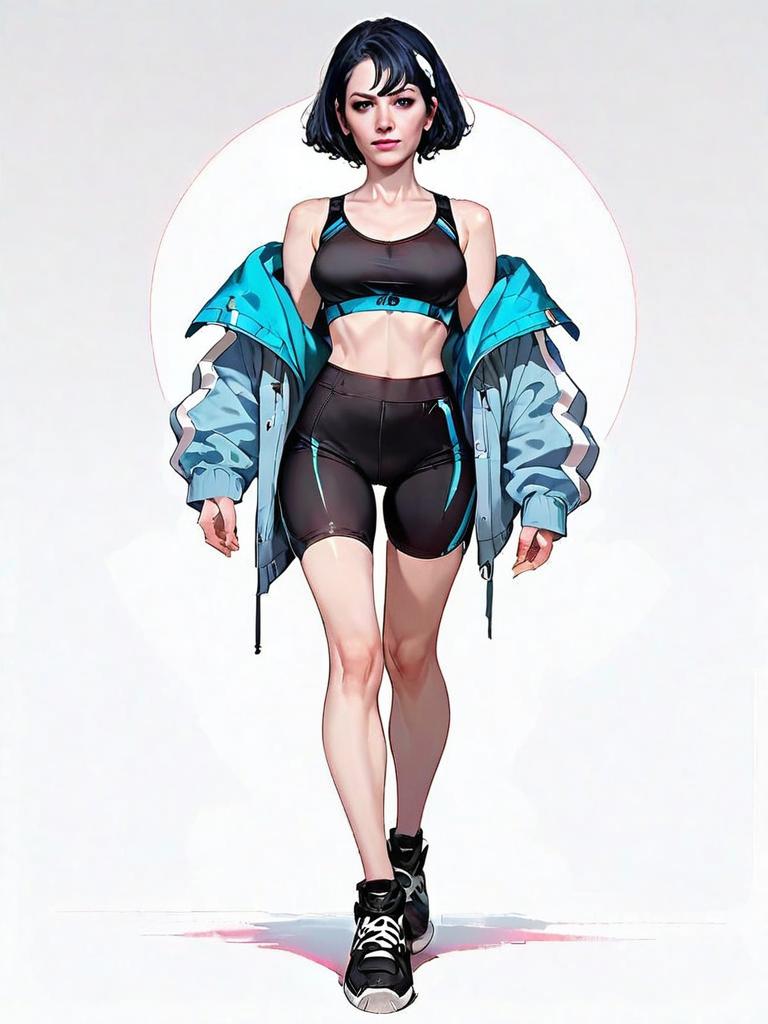 This digital artwork showcases a confident woman dressed in modern activewear, combining a black sports bra and bike shorts with a stylish blue jacket draped over her shoulders. The illustration features a realistic yet slightly stylized comic style with clean lines and vibrant colors, emphasizing both fashion and fitness.