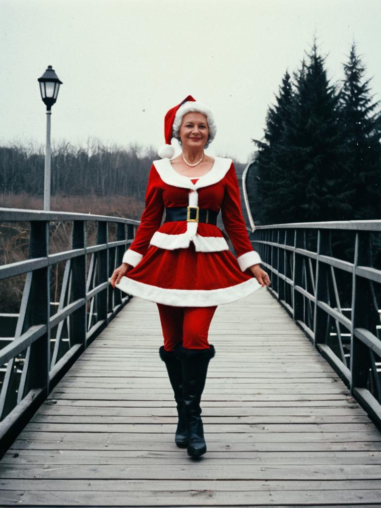Woman in Mrs. Claus Costume Standing on a Bridge Wearing Santa Outfit