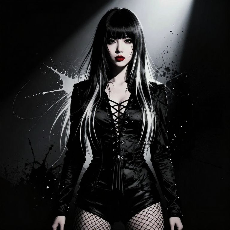 A striking gothic-style woman stands confidently against a dark, splattered background, dressed in a lace-up black corset top and fishnet stockings. Her long, straight hair with contrasting streaks and bold red lips enhance the dramatic and edgy atmosphere of the portrait.