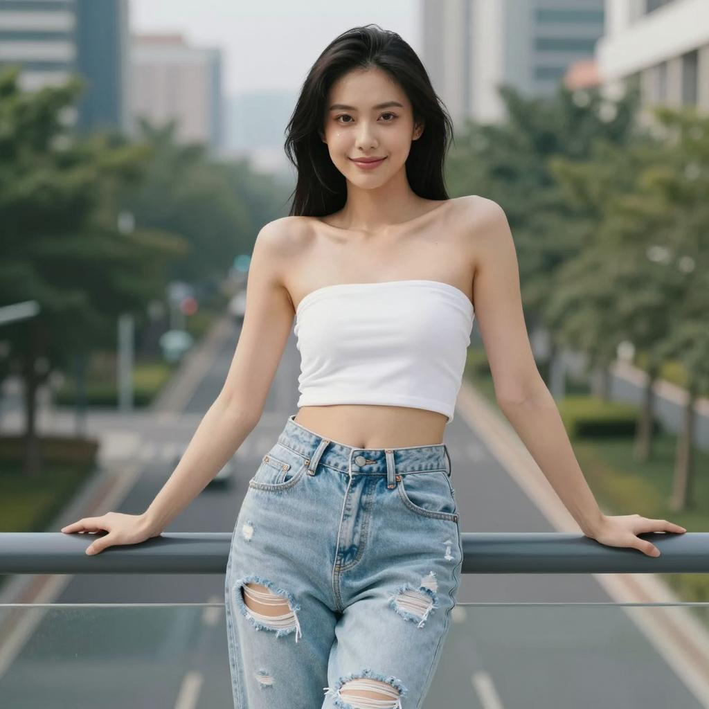 A stylish young woman leans casually against a city railing, wearing a white tube top and ripped high-waisted jeans. The image captures relaxed urban fashion and a confident, natural smile with a blurred city street in the background.