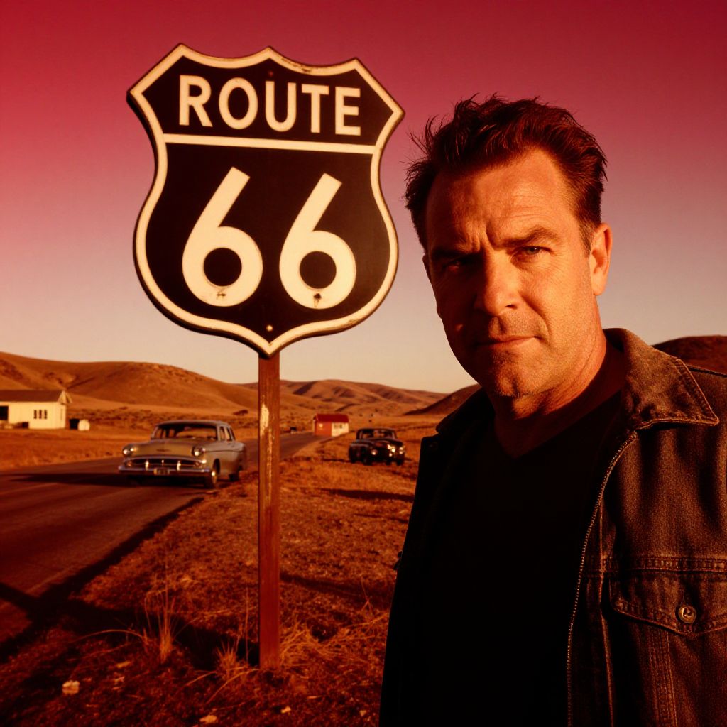 A man stands beside an iconic Route 66 road sign at sunset, with a classic car and rural buildings visible in the background. The warm, reddish lighting and vintage vehicles evoke a nostalgic, retro atmosphere along the historic American highway.