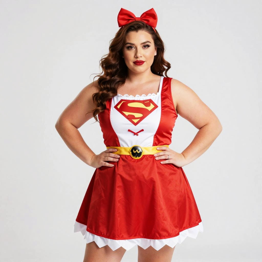 A confident plus-size woman poses in a vibrant red and white superhero costume inspired by Supergirl, complete with the iconic 'S' emblem on the chest, a yellow belt, and a matching red bow headband. The outfit blends playful Halloween style with classic comic book superhero elements, emphasizing boldness and empowerment.
